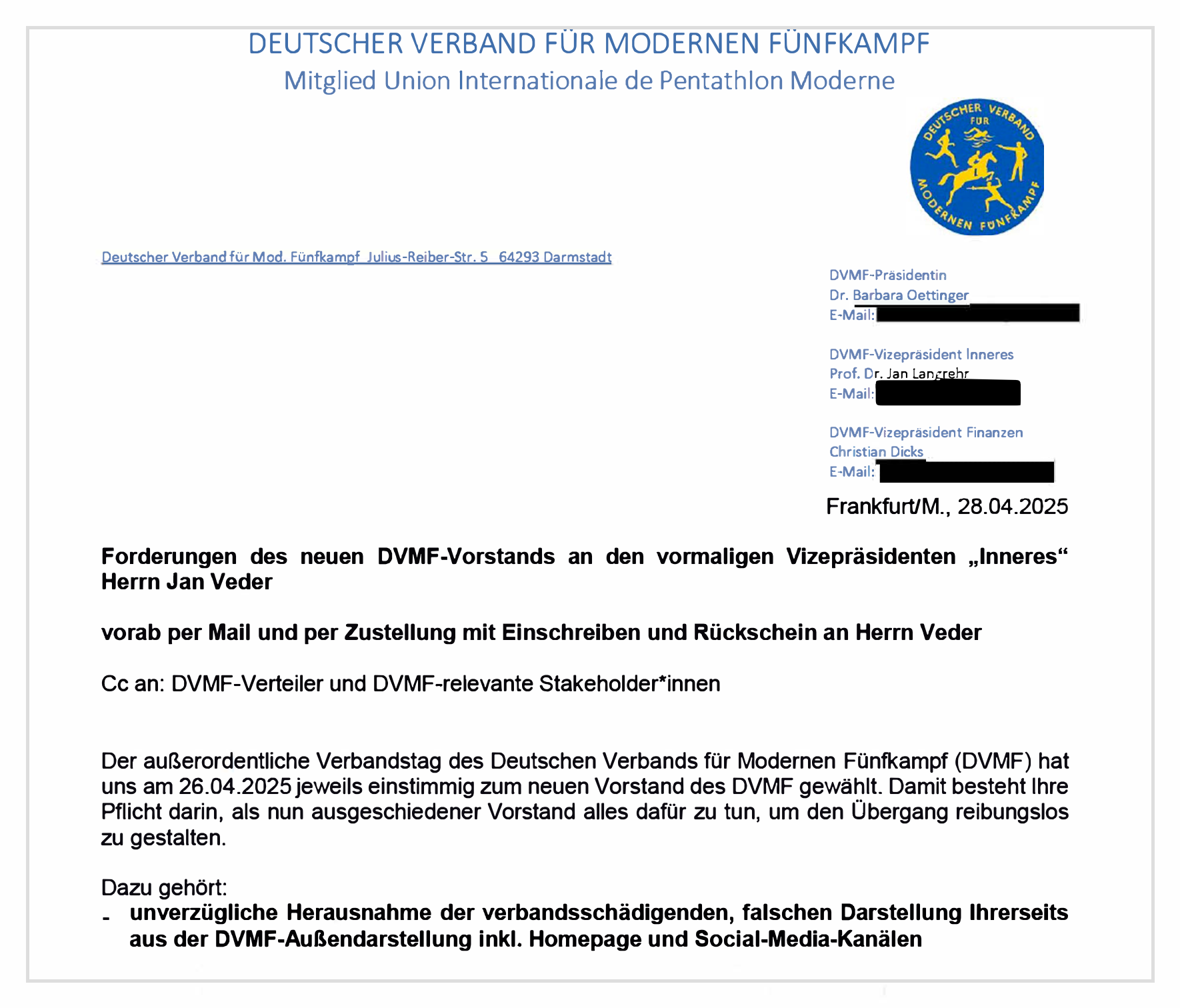 Oettinger und ihr neues Team hatten Veder am Montag aufgefordert, vor dessen dubioser Versammlung in Frankfurt, sämtliche Unterlagen, Zugang zu Konten, Datenbanken und zur Webseite und die Schlüssel zur DVMF-Geschäftsstelle zu übergeben.